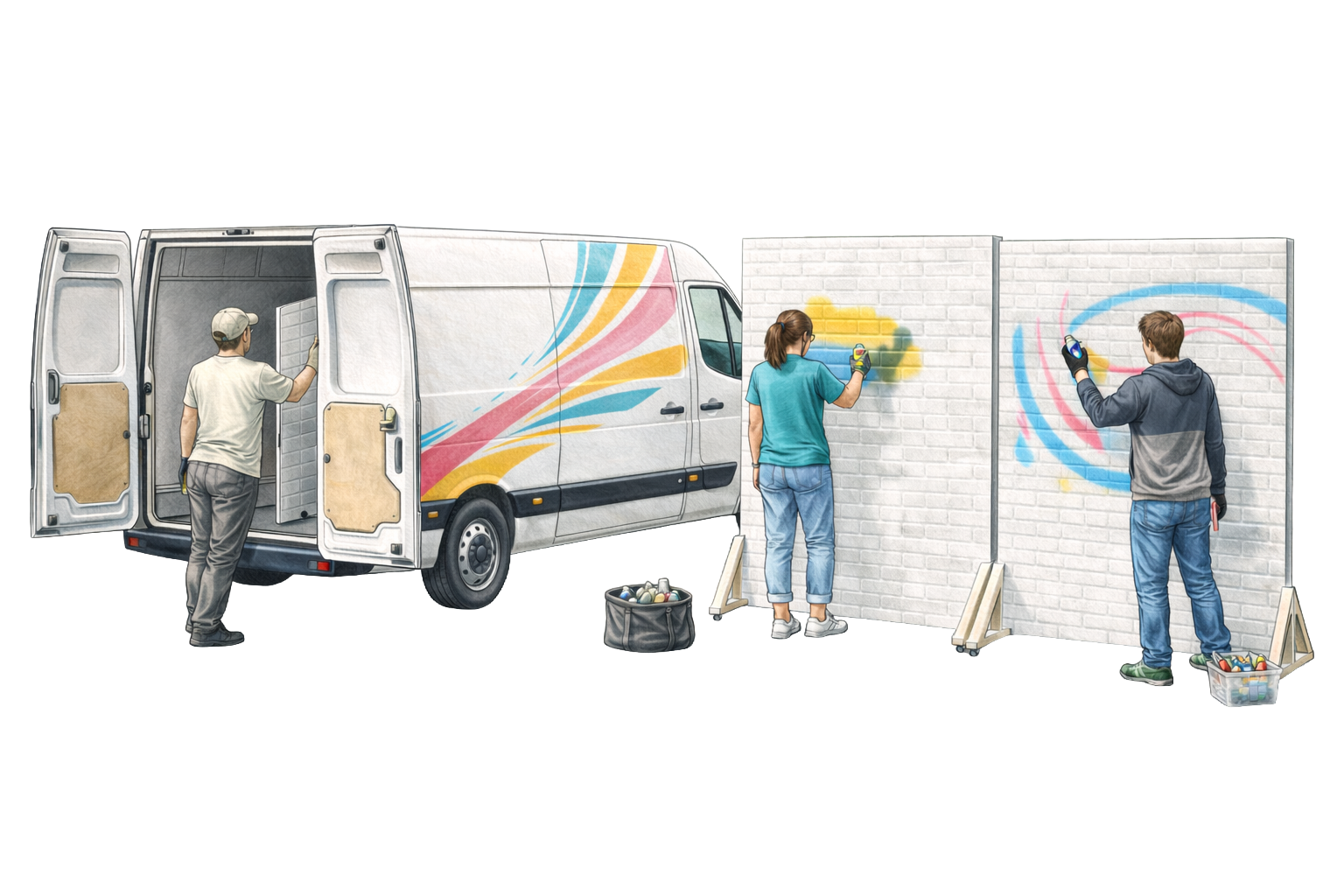 À l’arrivée du camion, nous déployons nos murs mobiles pour réaliser des fresques murales partout où vous le souhaitez, transformant instantanément le lieu en espace d’expression artistique.