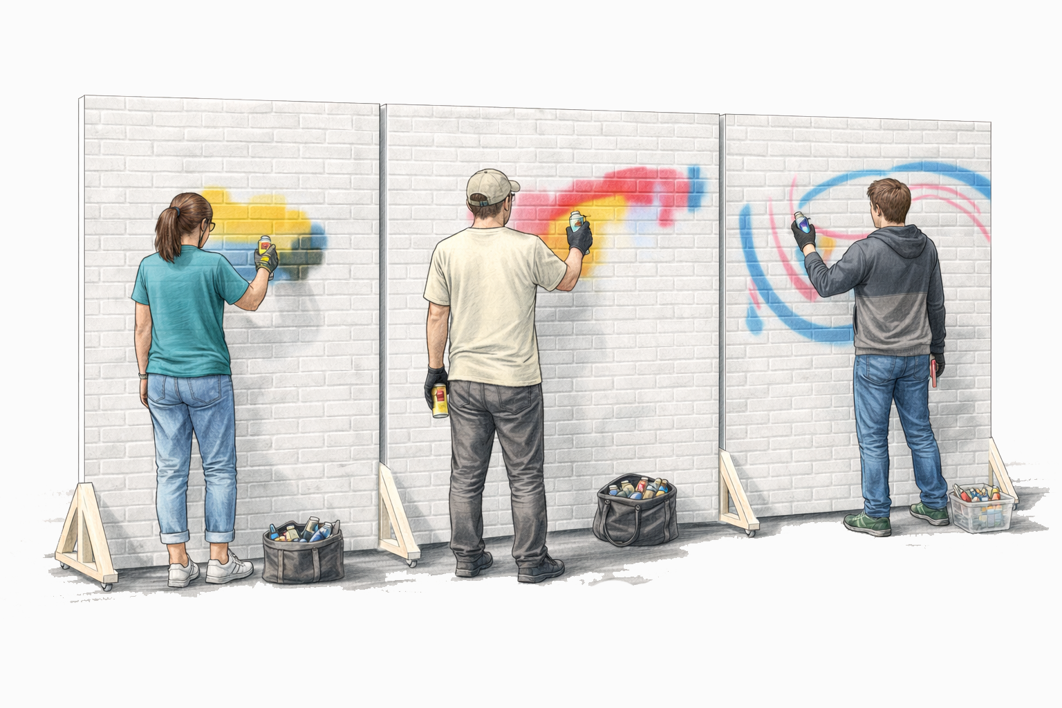 La fresque itinérante est une expérience artistique participative réalisée sur des murs mobiles autonomes, installables sans intervention sur les murs existants.