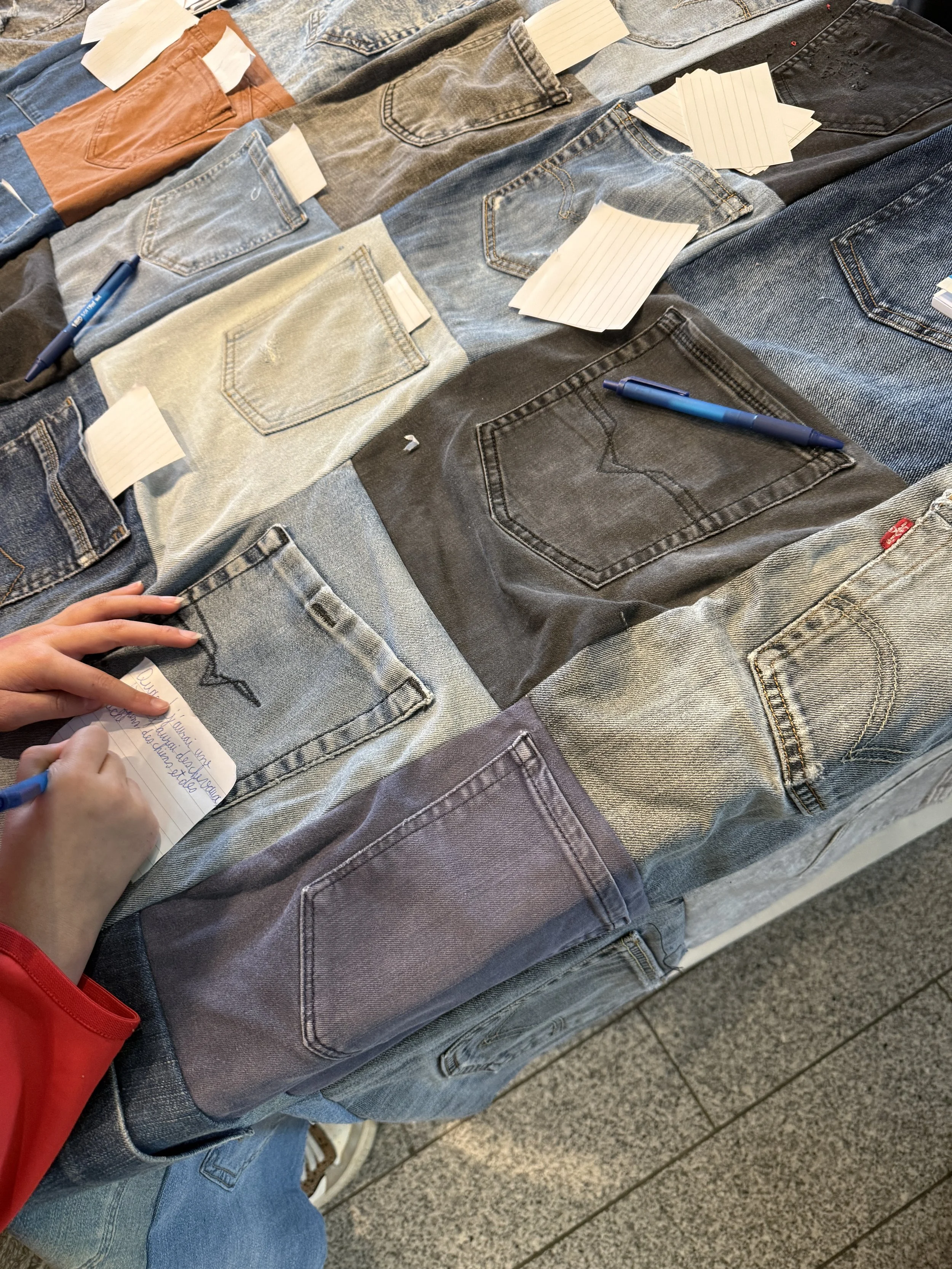 Les enfants ont ensuite pu plonger la main dans notre Patchwork Kholab, composé de poches de jeans recyclés, pour en extraire un petit papier. Ils y ont écrit un rêve, un souhait ou un message personnel, avant de le déposer directement dans les deux poches intégrées à la fresque ILY Tree.