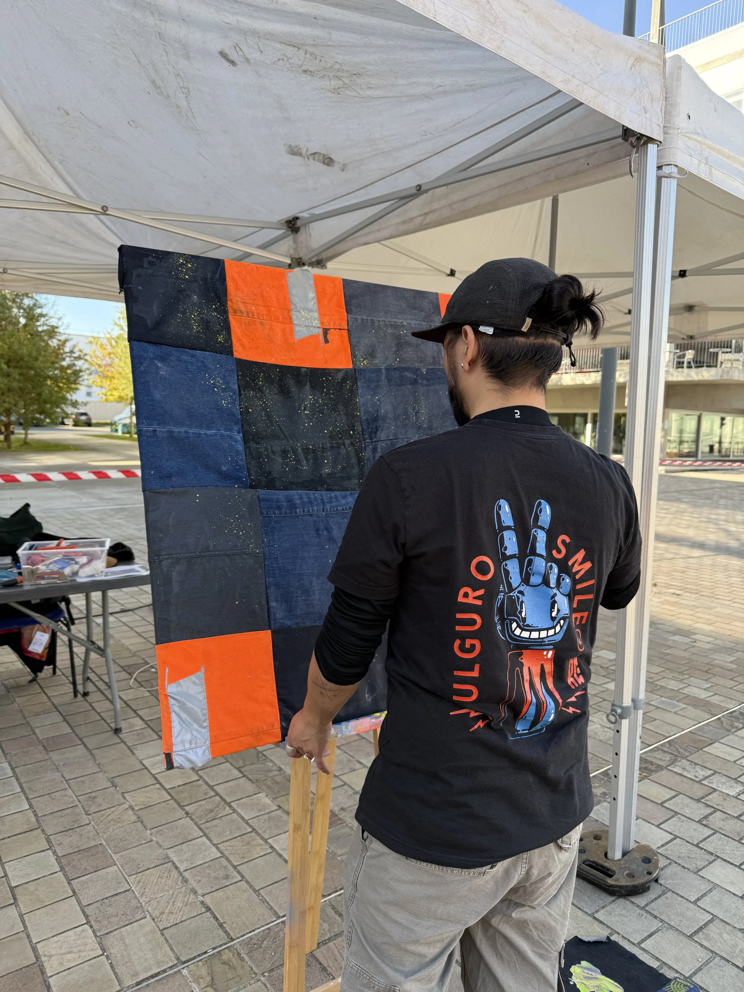 L’artiste Kekli a réalisé en live une œuvre sur une toile Kholab composée de jeans et de vêtements professionnels recyclés, donnant une seconde vie à la matière textile tout en livrant une création engagée.