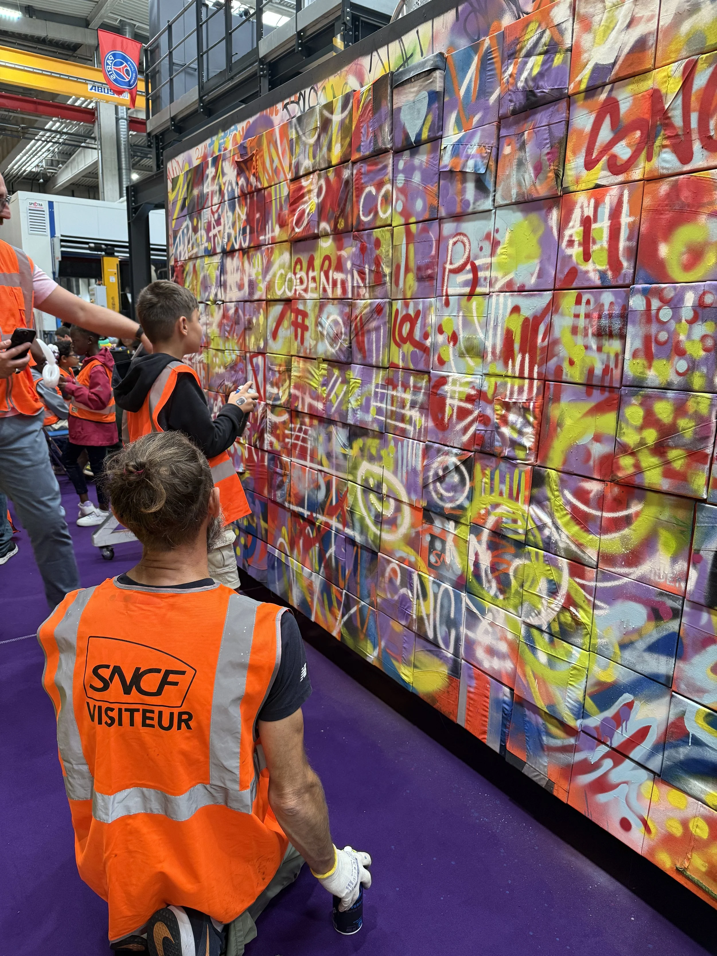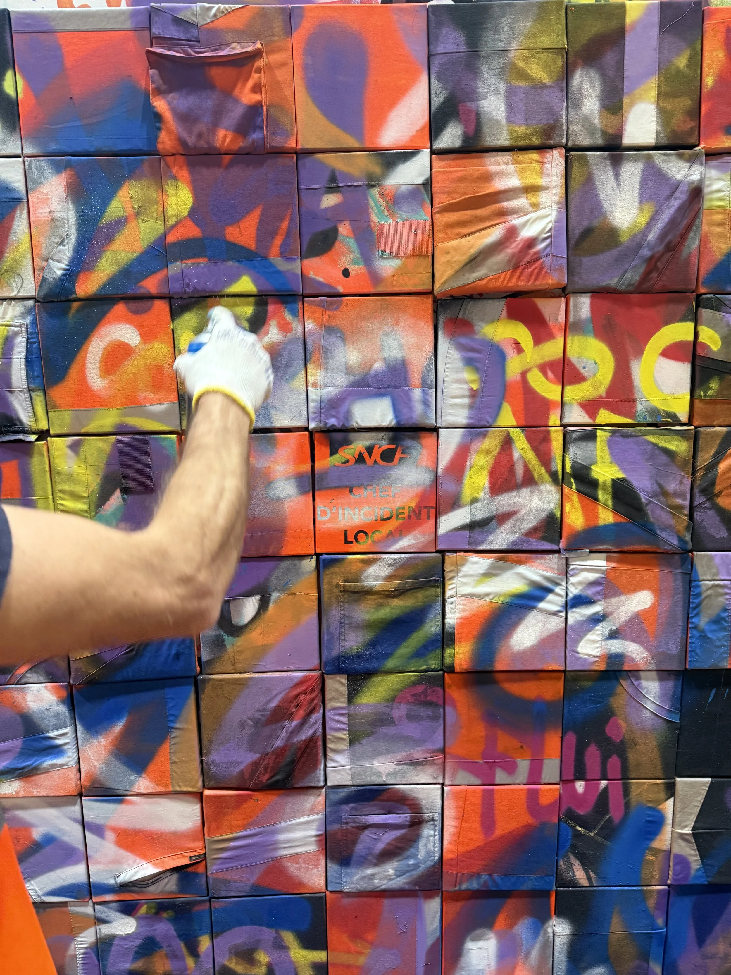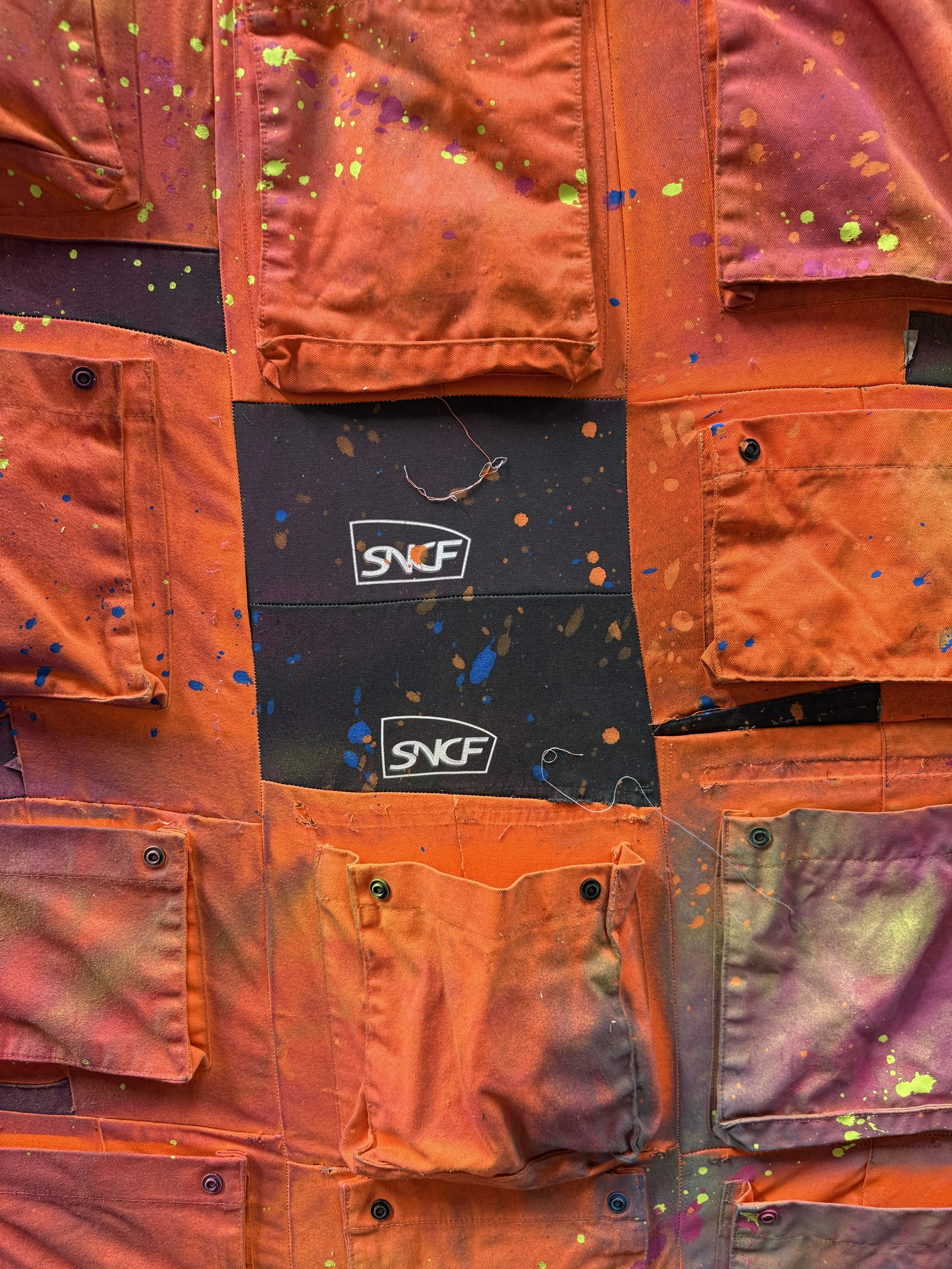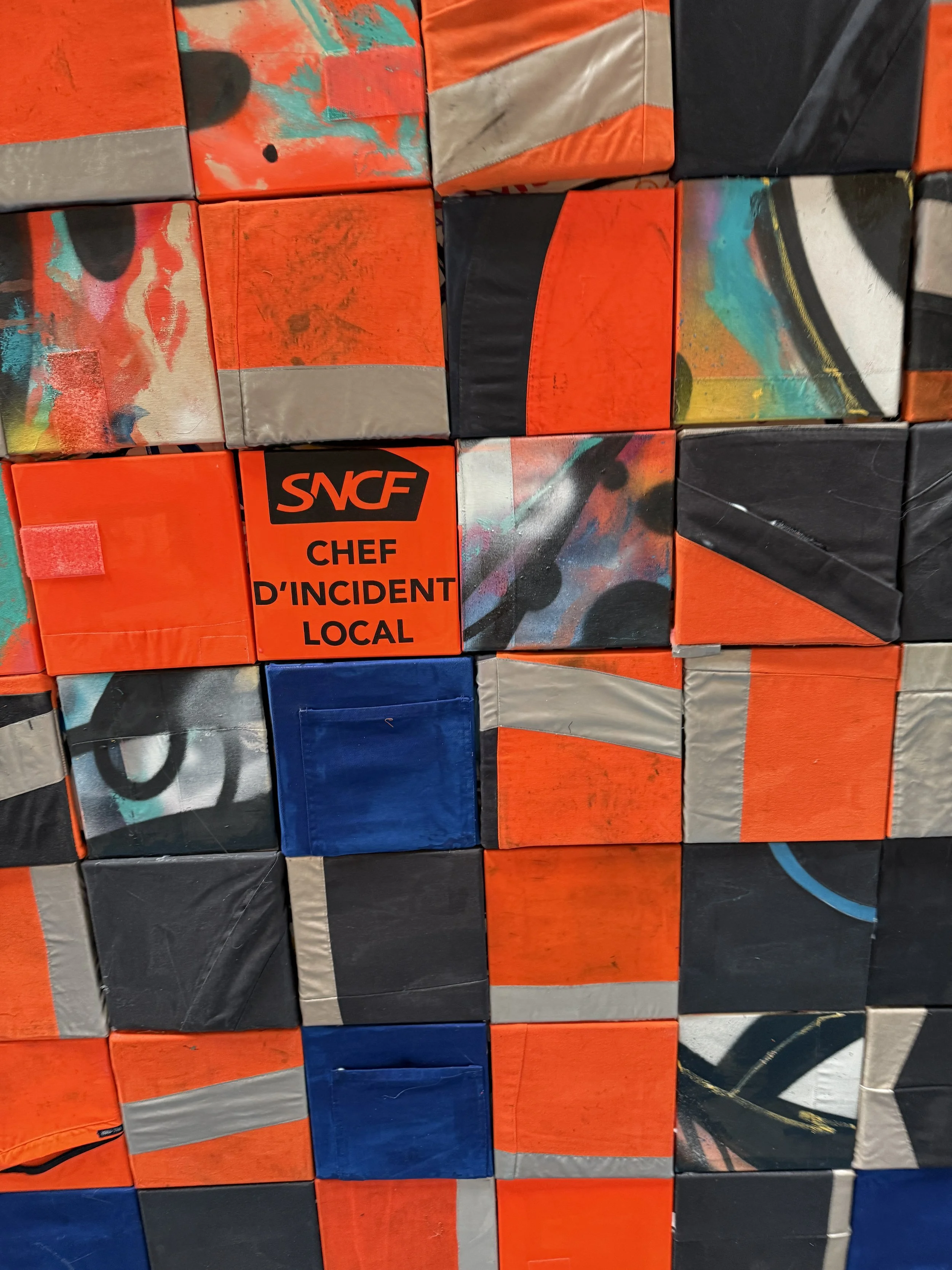 Aux côtés de l’artiste KN, nous avons réalisé une fresque participative composée de 150 toiles créées à partir des vêtements professionnels du Technicentre, transformant les uniformes en une œuvre collective et symbolique.