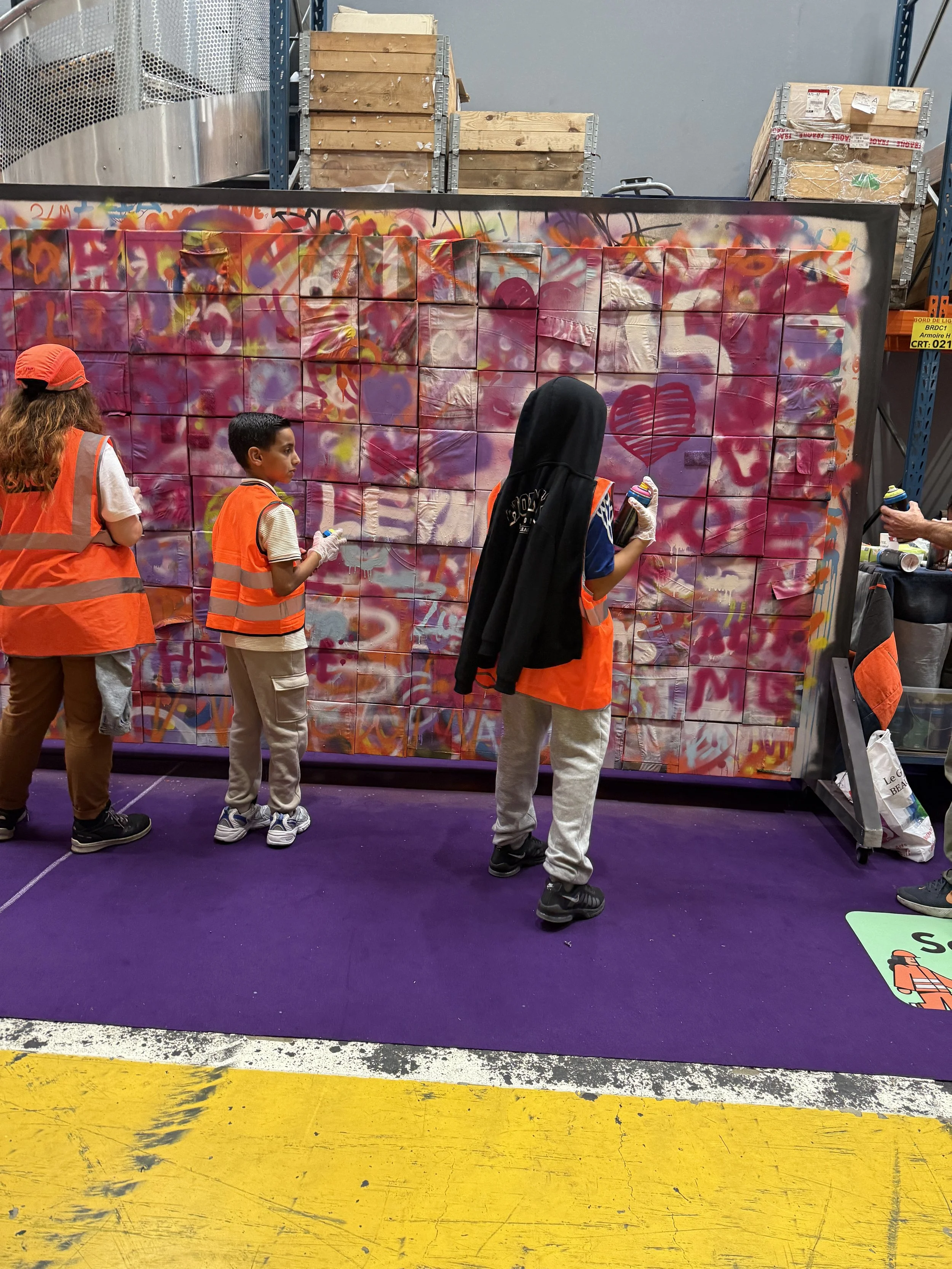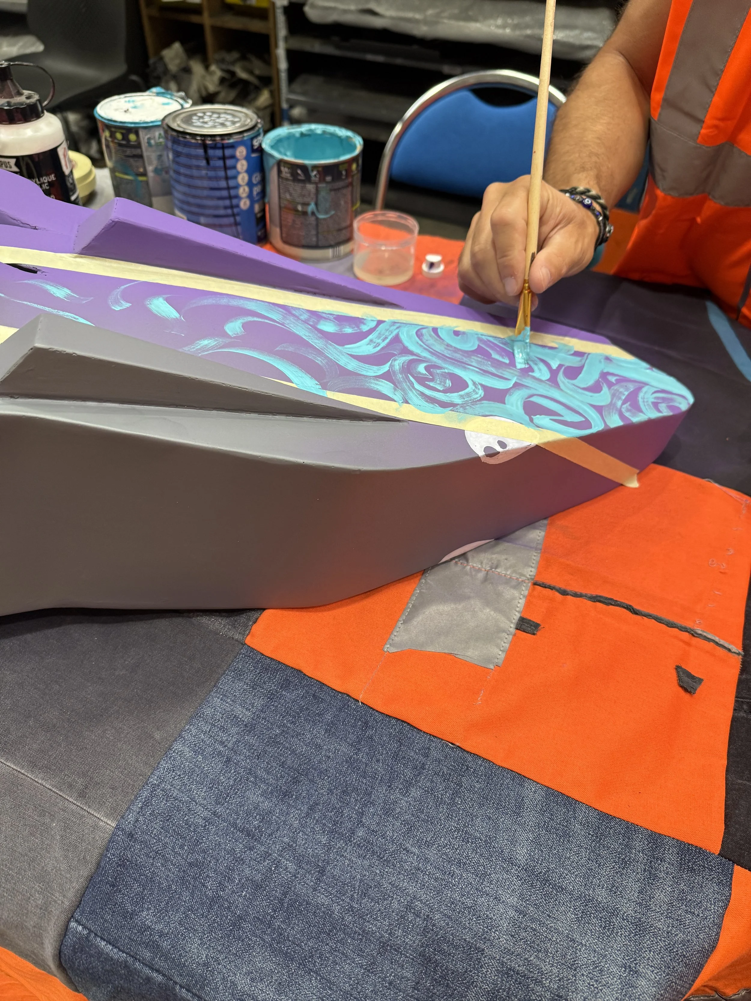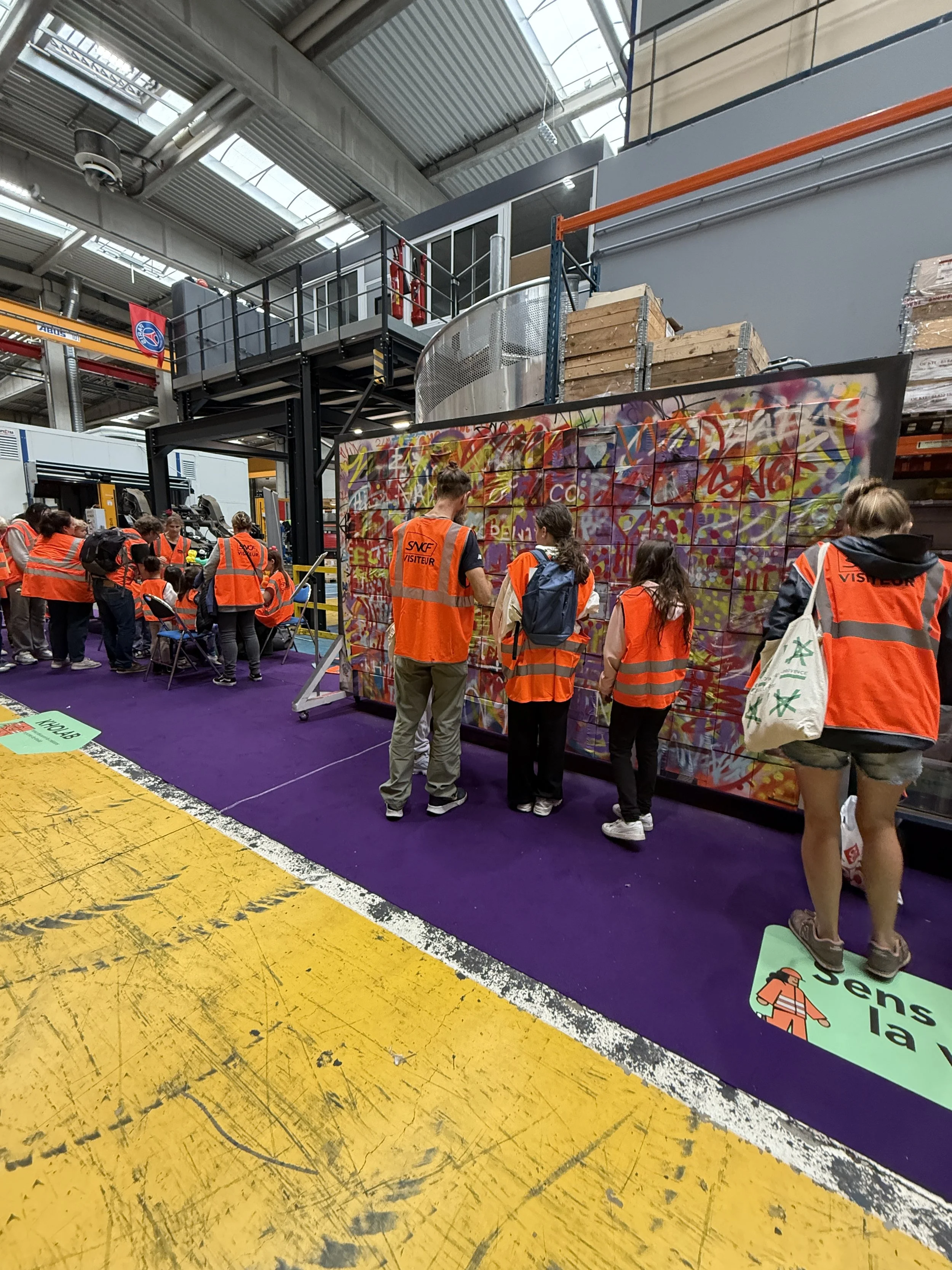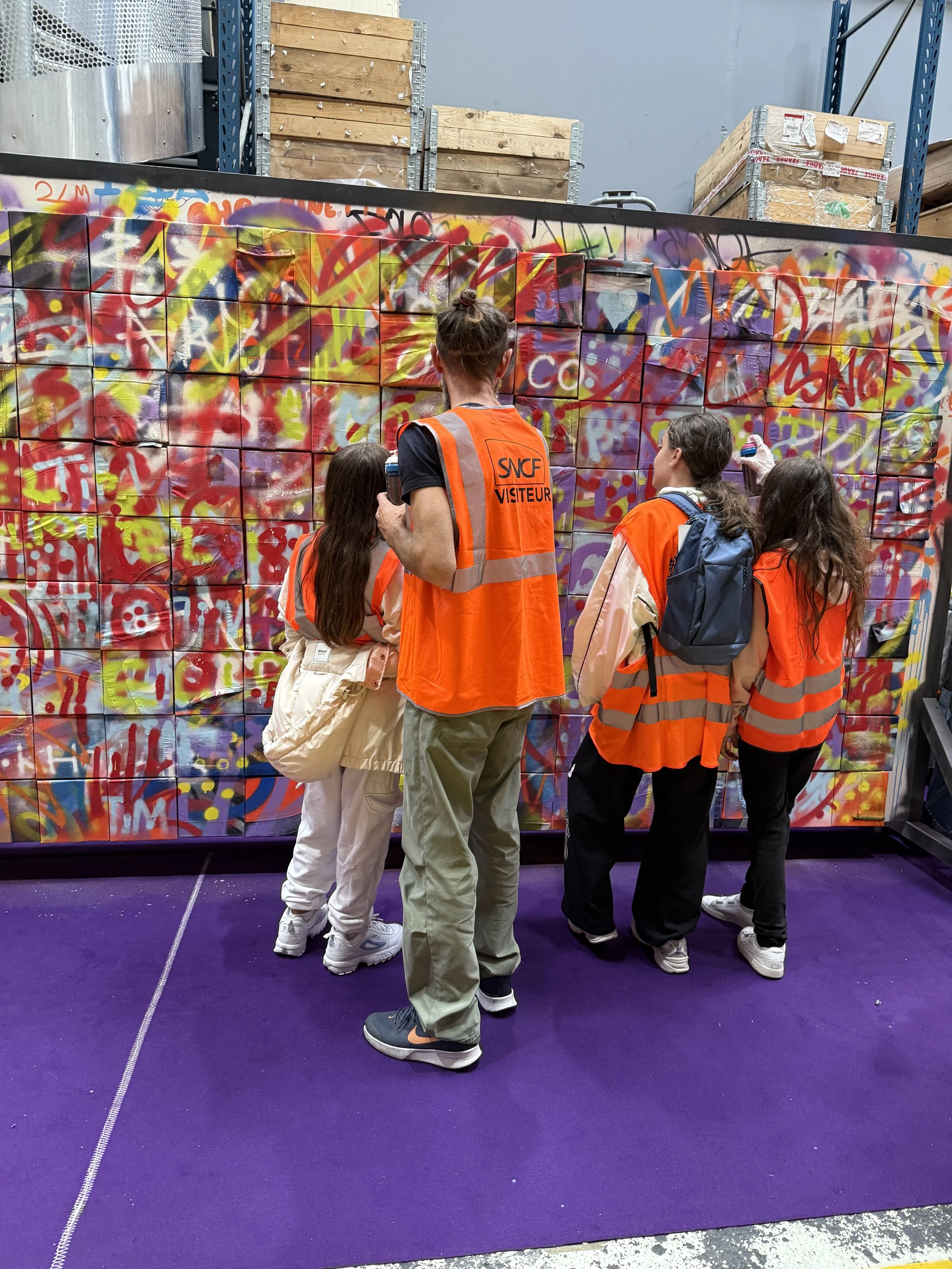 Aux côtés de l’artiste KN, nous avons réalisé une fresque participative composée de 150 toiles créées à partir des vêtements professionnels du Technicentre, transformant les uniformes en une œuvre collective et symbolique.